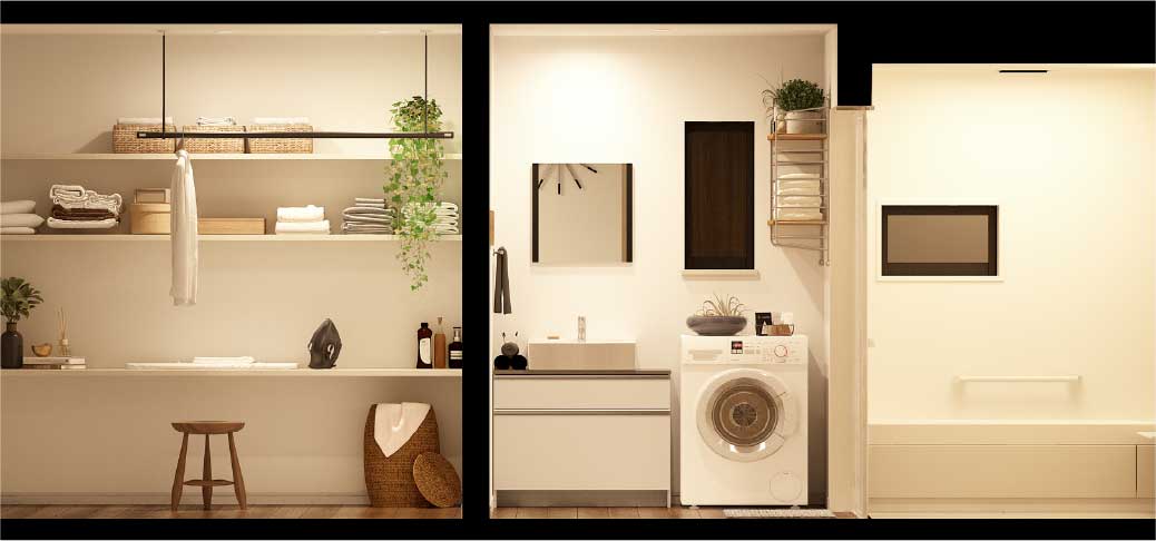 水回りが一直線に並び、 毎日の洗濯がしやすく快適に。